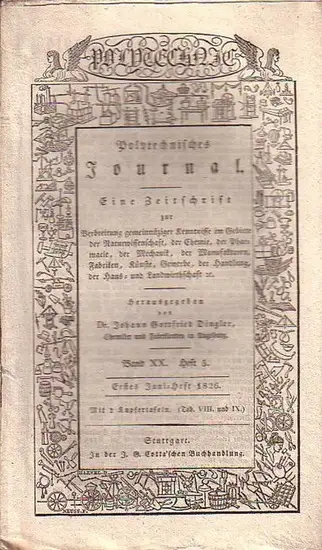Polytechnisches Journal. Hrsg. v. Johann Gottfried Dingler: Polytechnisches Journal. Band XX. Heft 5, Erstes Juni=Heft 1826. (= 7. Jahrgang, 11. Heft). Eine Zeitschrift zur Verbreitung gemeinnüziger Kenntnisse im Gebiete der Naturwissenschaft, der Chem