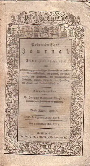 Polytechnisches Journal. Hrsg. v. Johann Gottfried Dingler: Polytechnisches Journal. Band XXIV. Heft 5, Erstes Juni=Heft 1827. (= 8. Jahrgang, 11 Heft). Eine Zeitschrift zur Verbreitung gemeinnüziger Kenntnisse im Gebiete der Naturwissenschaft, der Che