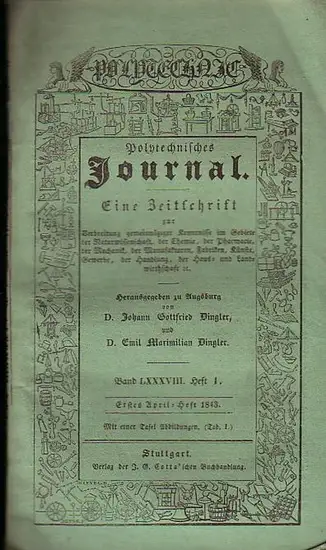 Polytechnisches Journal. Hrsg. v. Johann Gottfried Dingler und Emil Maximilian Dingler: Polytechnisches Journal. Band LXXXVIII. Heft 1. Erstes April =Heft 1843. (= 24. Jahrgang, 7. Heft). Eine Zeitschrift zur Verbreitung gemeinnüziger Kenntnisse im G