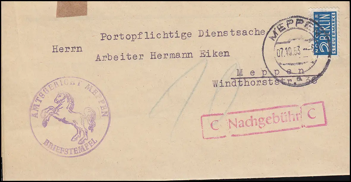 Portopflichtige Dienstsache mit Notopfer Amtsgericht MEPPEN 7.10.53 als Ort-Bf.