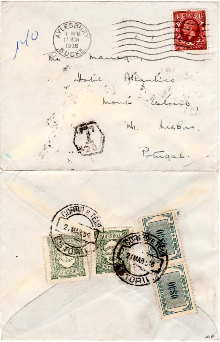 Portugal 1936, 4 Portomarken rücks. auf GB Brief m. 1 1/2d v. Aylesbury