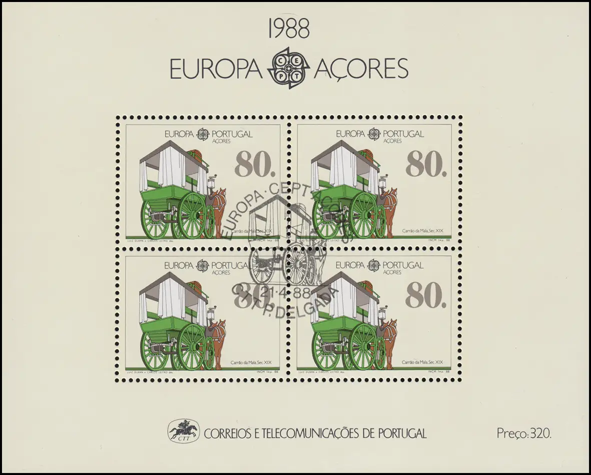 Portugal-Azoren Block 9 Europaunion CEPT Pferdeomnibus 1988, ESSt CTTR DELGADA