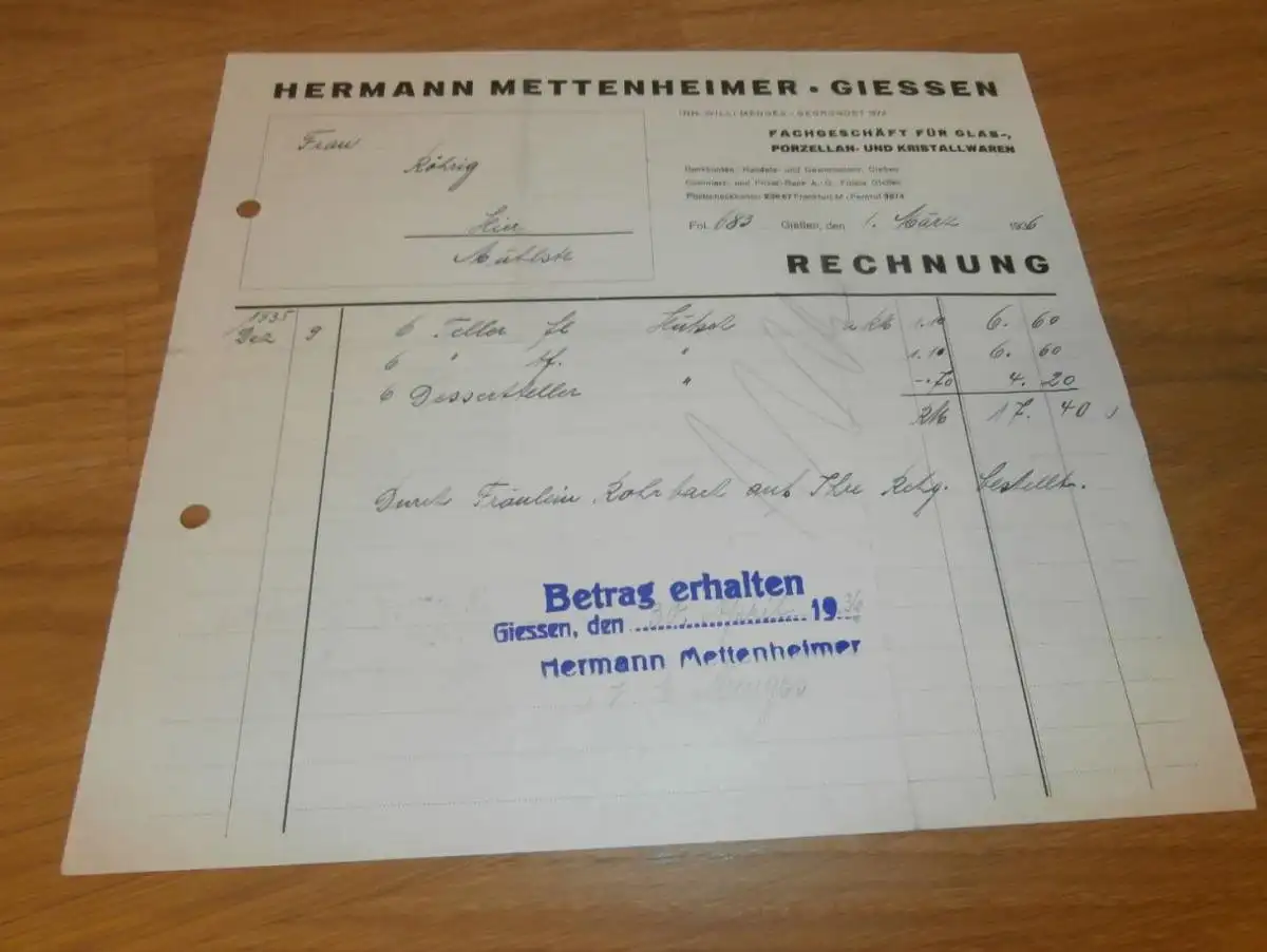 Porzellan - Heinrich Mettmann in Gießen , 1936 , altes Dokument / Rechnung , Reklame / Werbung , Giessen !AZ9-W