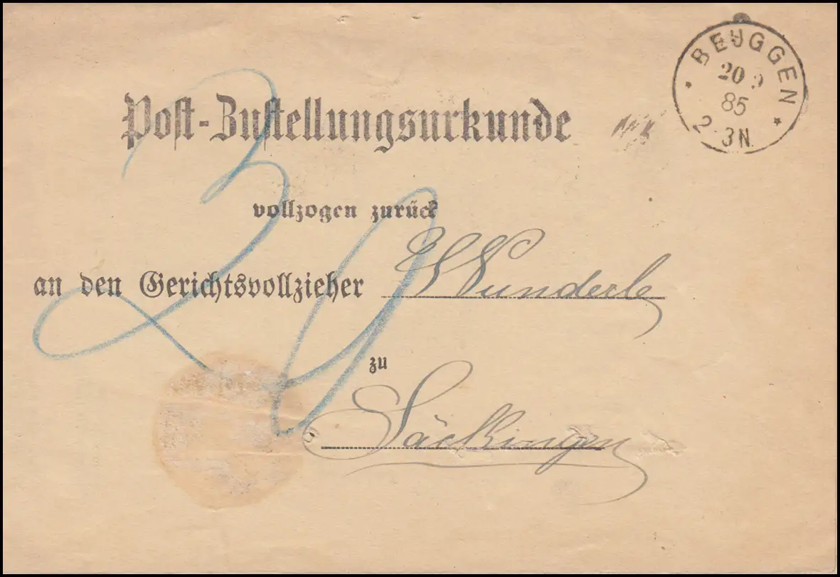 Post-Zustellungsurkunde BEUGGEN 20.9.85 an Gerichsvollzieher in SÄCKINGEN 20.9.