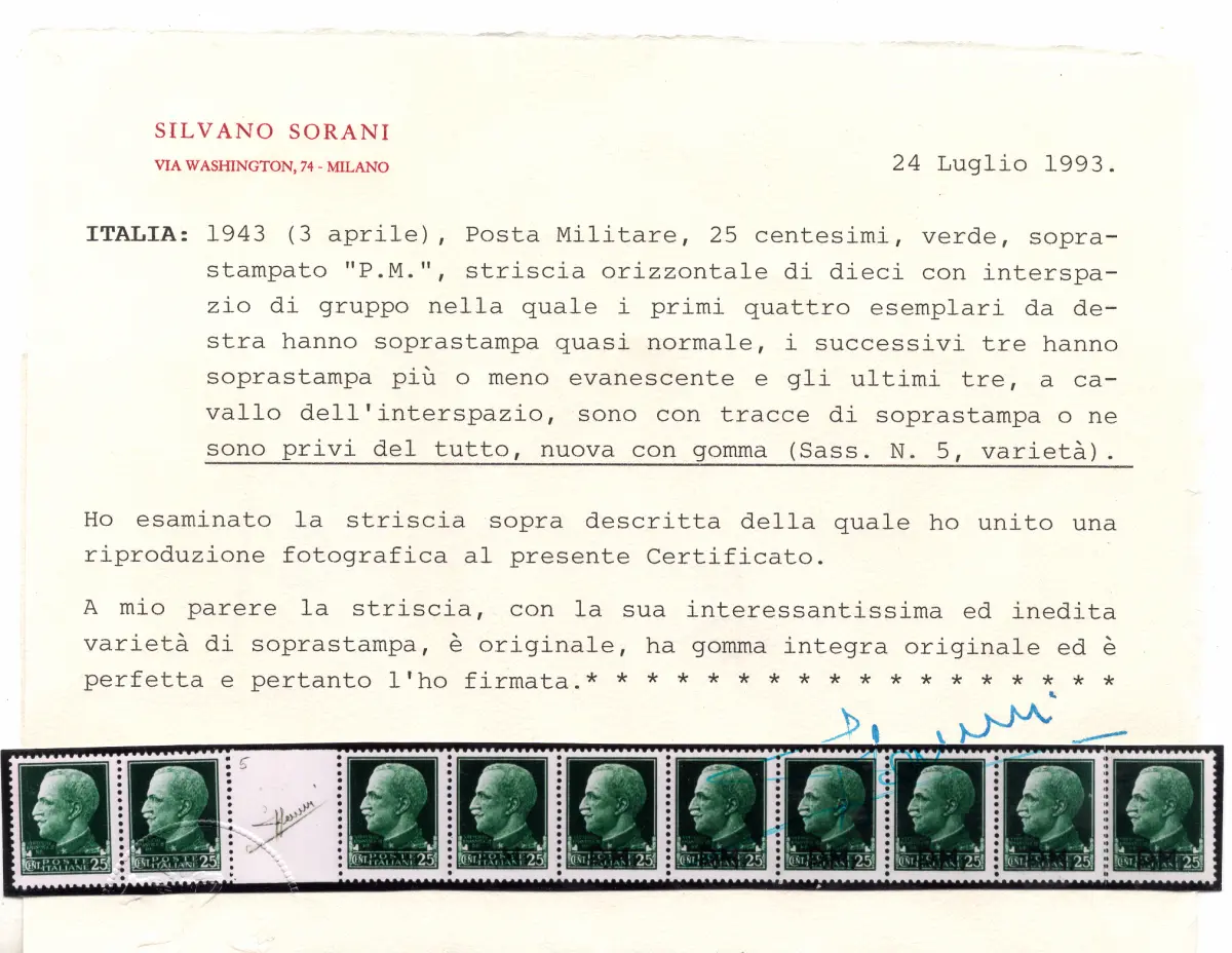 MNH - VOLLGUMMI - Imperiale Cent. 25 Aufdruck P.M. Nr. 5. horizontaler Zehnstreifen mit Gruppenabstand, in dem die ersten vier Exemplare aus dem rechten Jahr fast normal überdruckt sind, die nächsten drei mehr oder weniger verblassenden Aufdruck haben und die letzten drei, am Ende des Zwischenraums, völlig leer sind - Der Streifen, einer von zehn bekannten, ist perfekt mit Vollgummi - Selten - Sorani Zertifikat Katalog euro3750 Cod.2403/WEB