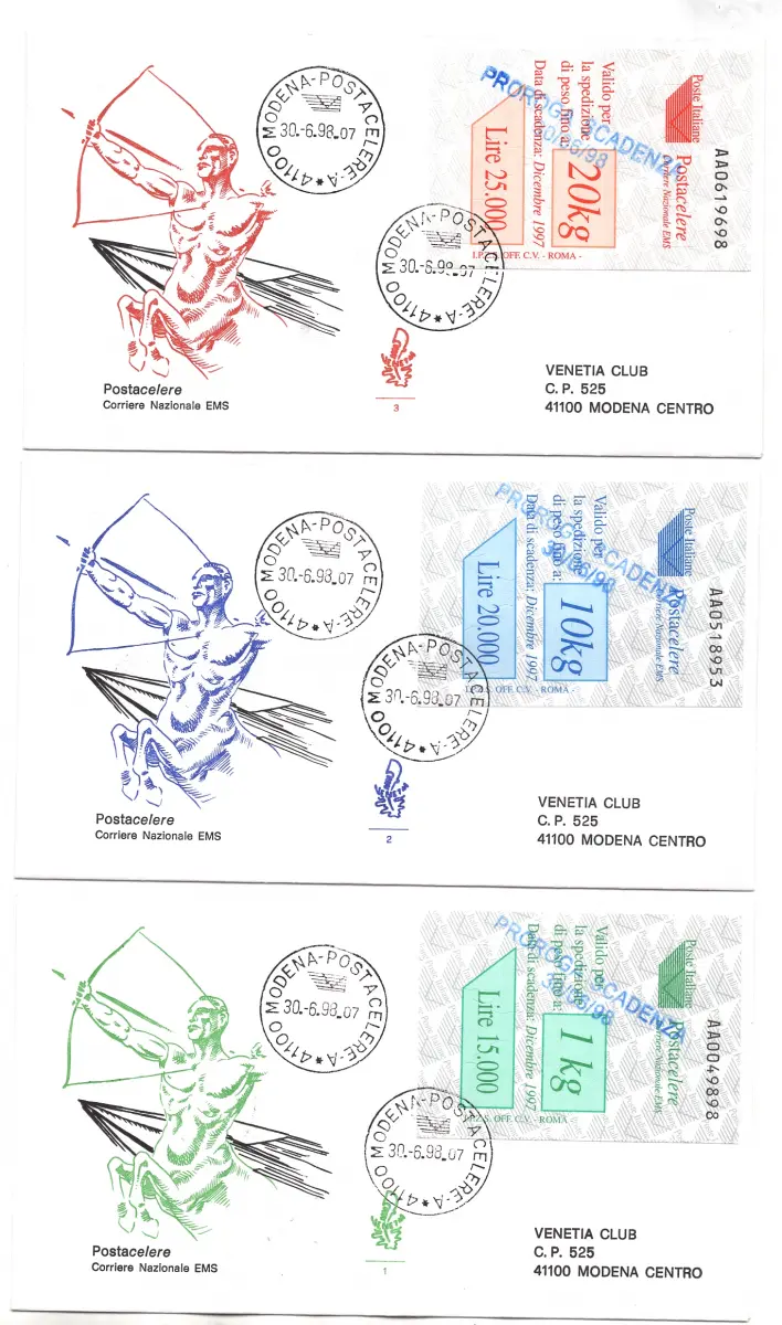 Umschlag - Postacelere Nr. 4/6 die Serie von drei Gutscheinen mit Stornierung verlängert Ablauf 30/6/98 auf drei FDC Venetia Club Umschlägen gereist mit Stornierung der Ankunft - Selten zusammen Cod. 3636/WEB