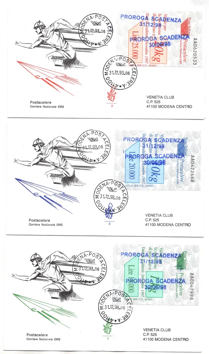 Umschlag - Postacelere Nr. 7a/9a die Serie von drei Gutscheinen mit doppelter Stornierung verlängert die Frist bis zum 30.6.98 + 31.12.98 auf drei FDC Venetia Club Umschlägen, die mit Stornierung der Ankunft gereist sind - Selten zusammen Cod. 3638/WEB