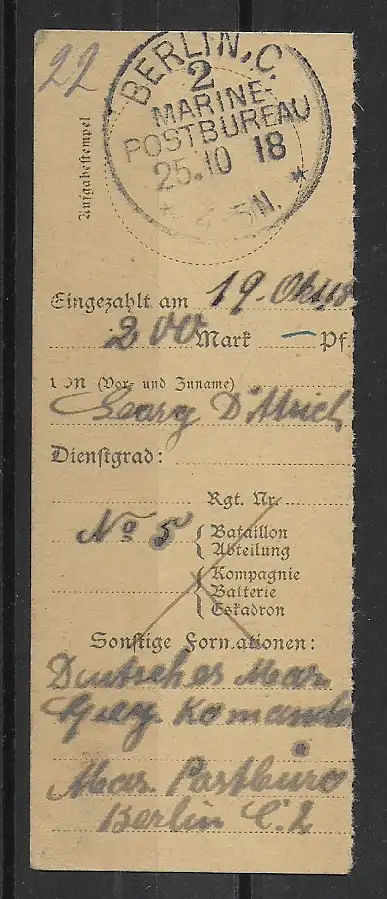 Postanweisung Abschnitt: Berlin, Marine Postbüro 1918