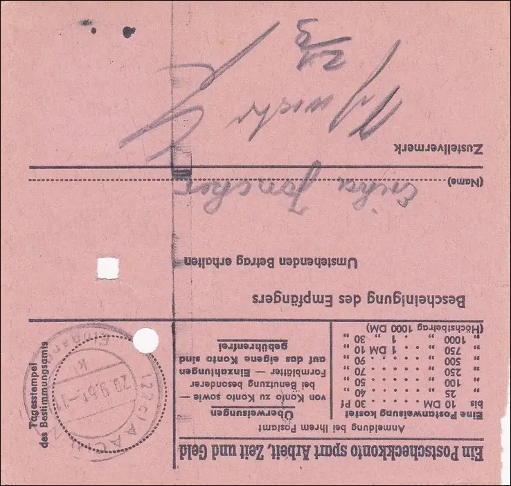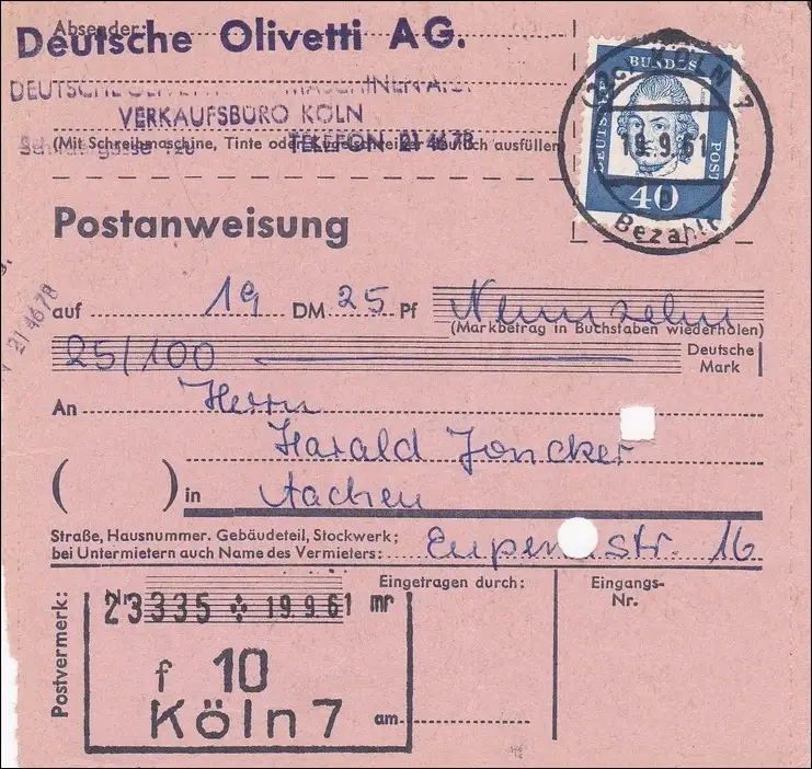 Postanweisung Olivetti AG Köln nach Aachen - Einzelfrankatur 1961