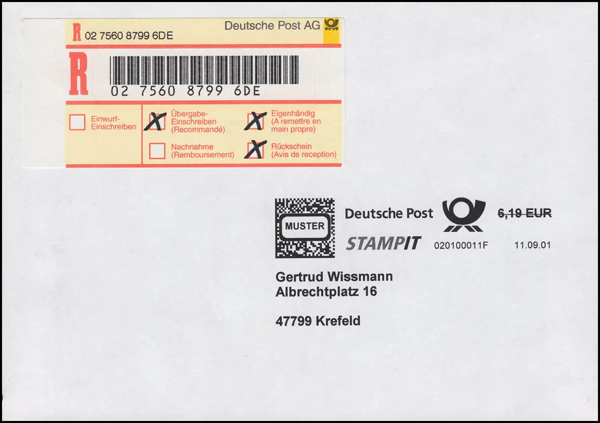 Postautomation: STAMPIT (PC-Frankatur) - MUSTER mit R-Label vom 11.9.2001