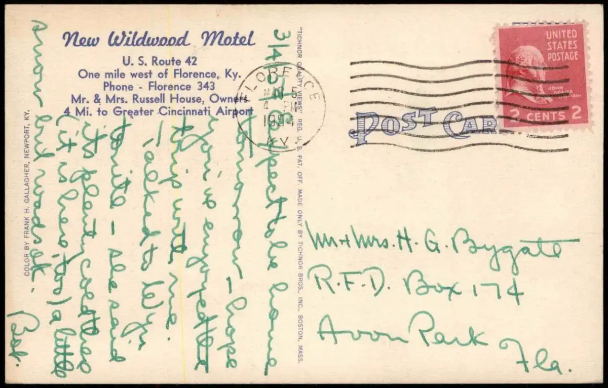 Postcard Florence Kentucky New Wildwood Motel USA 1954