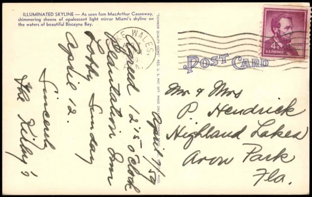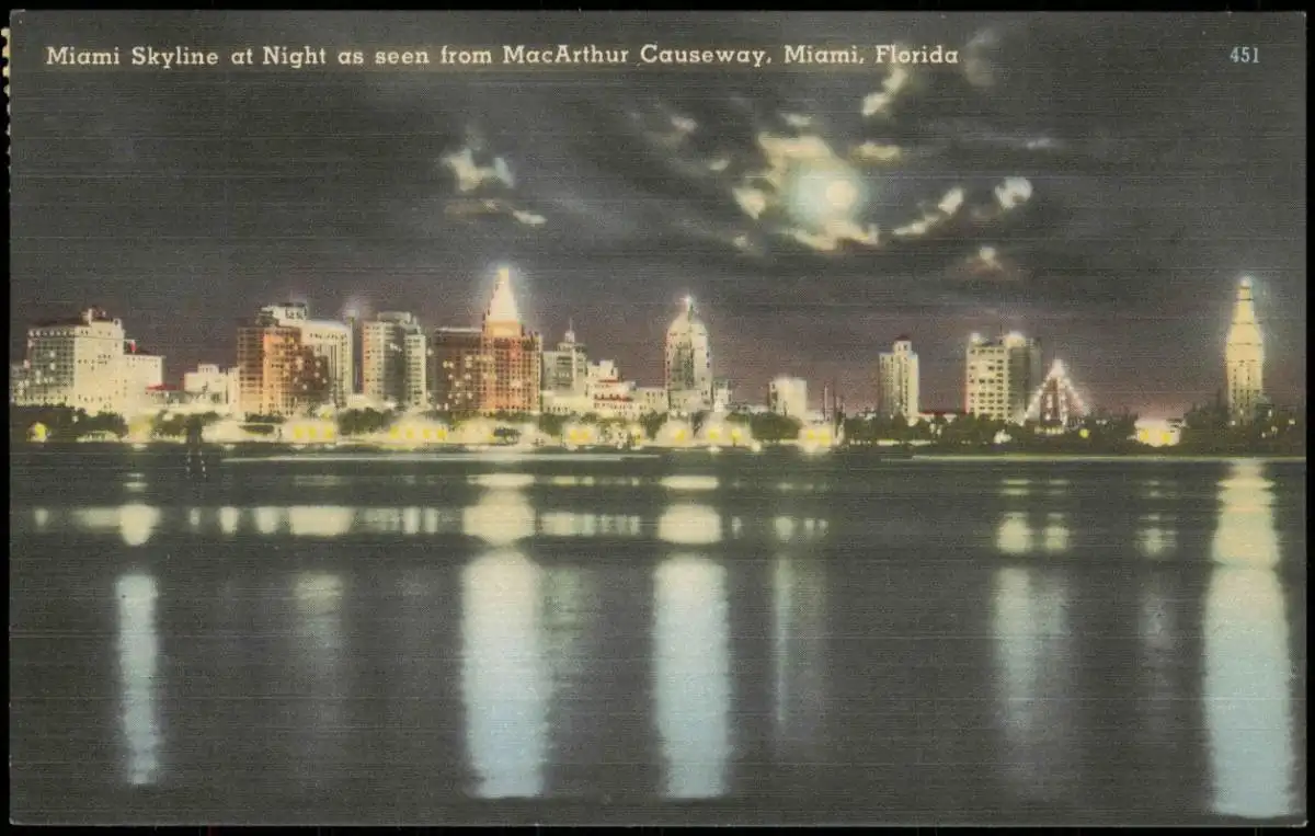 Postcard Miami Skyline at Night - Florida 1959