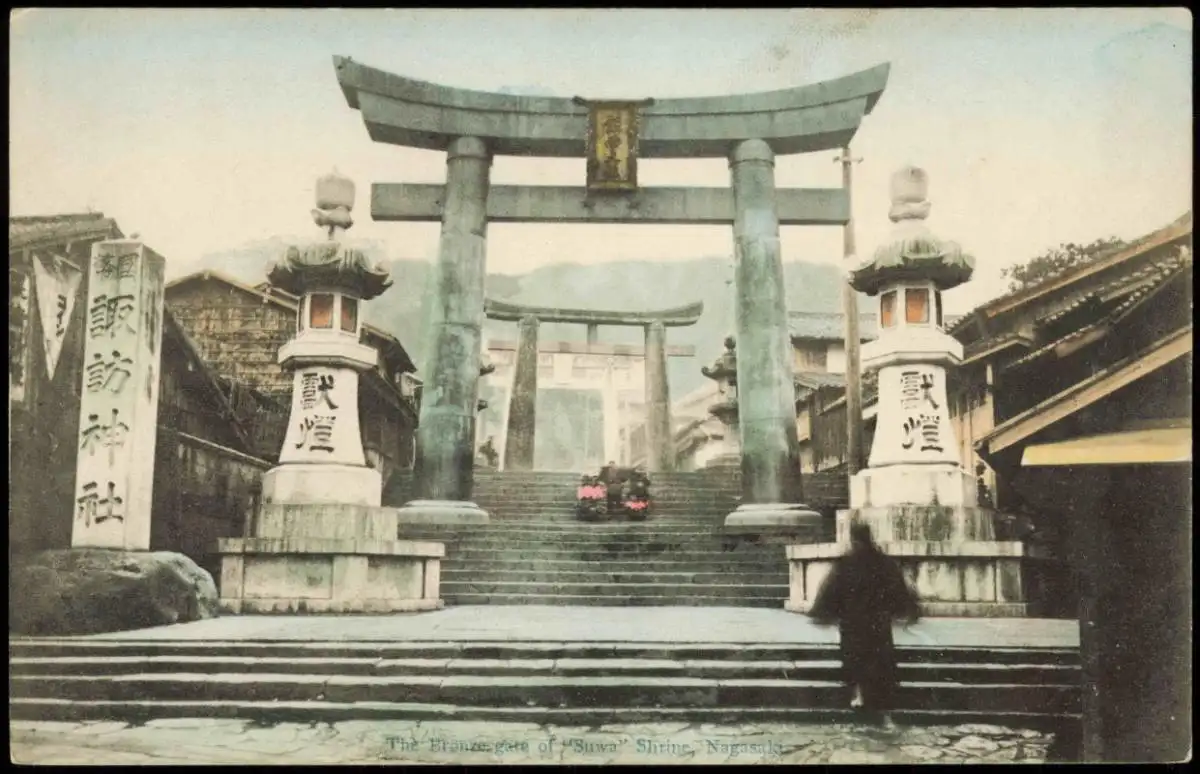 Postcard Nagasaki The Bronze gate of Suwa Shrine (Japan Tempel) 1910
