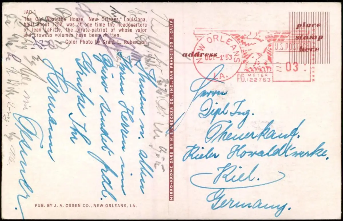 Postcard New Orleans Absinthe House 1953 US POSTAGE Stempel Bezahlt-Stempel