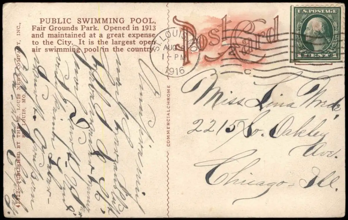 Postcard Saint Louis PUBLIC SWIMMING POOL Fair Grounds Park 1916