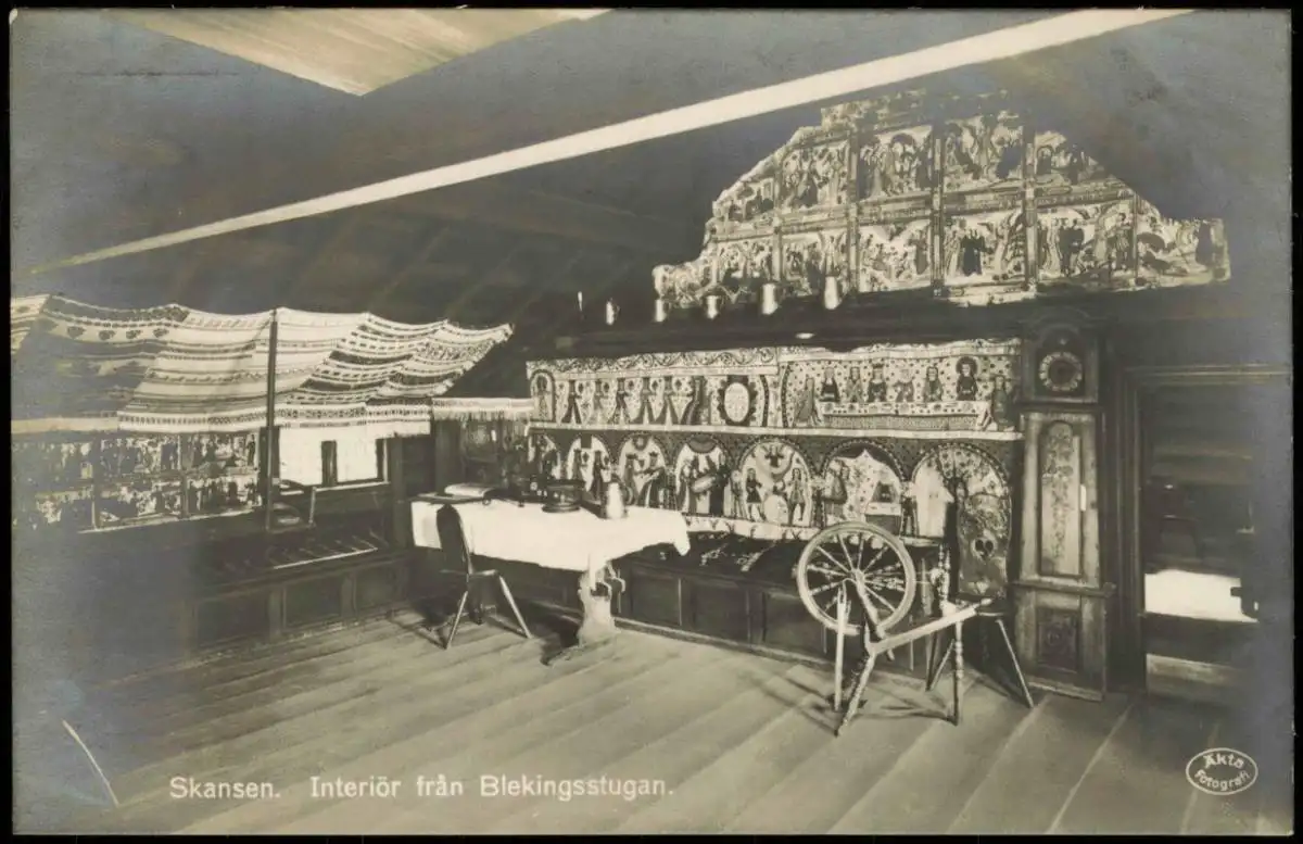 Postcard Stockholm Skansen. Interiör från Blekingsstugan. 1928