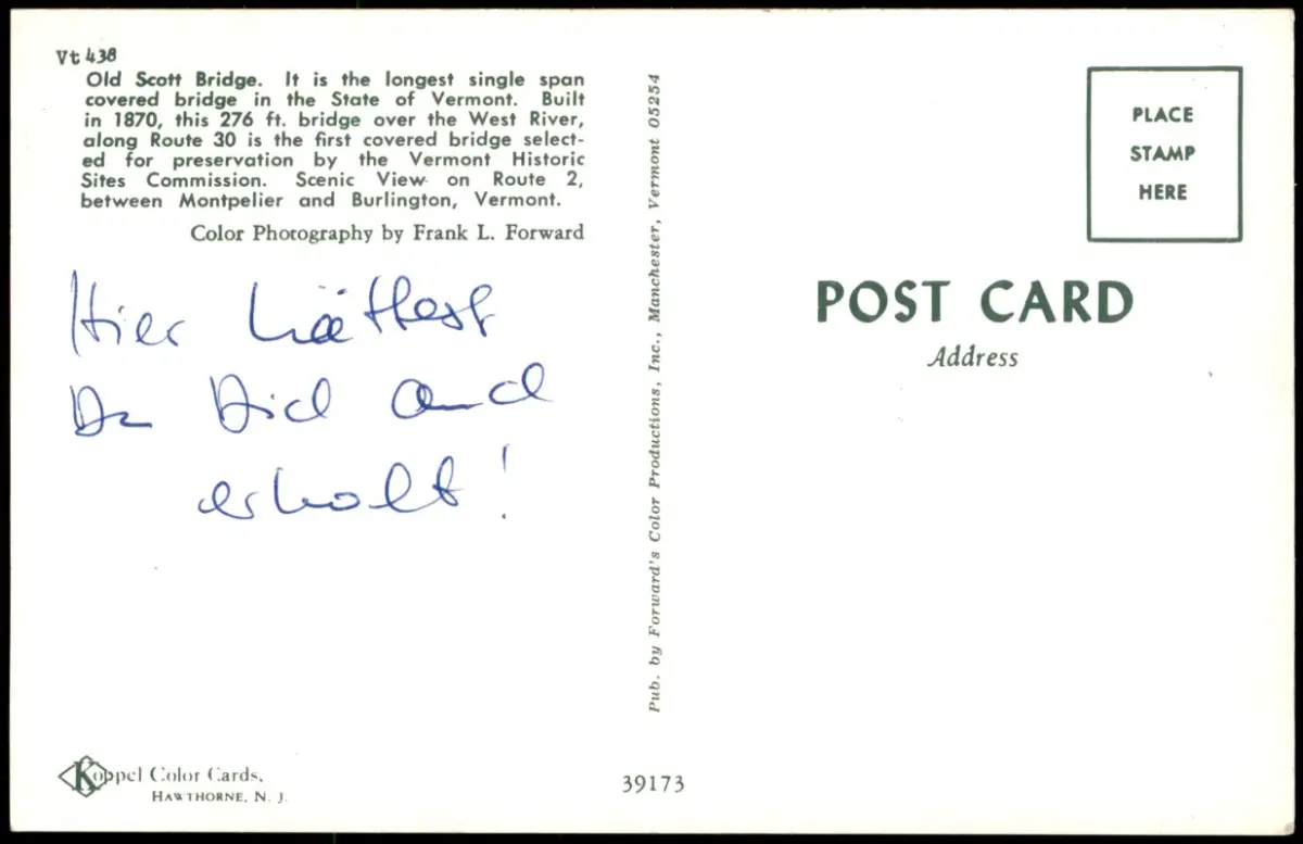 Postcard Vermont 2 Bild Old Scott Brigde 1972