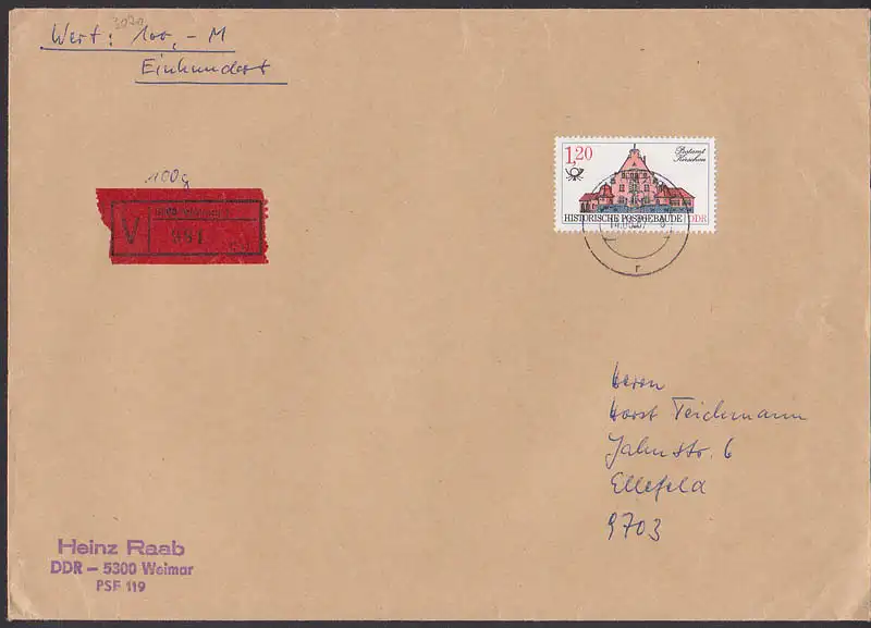 Postgebäude Postamt Kirschau 1,20 in EF auf Wertbrief (3070)