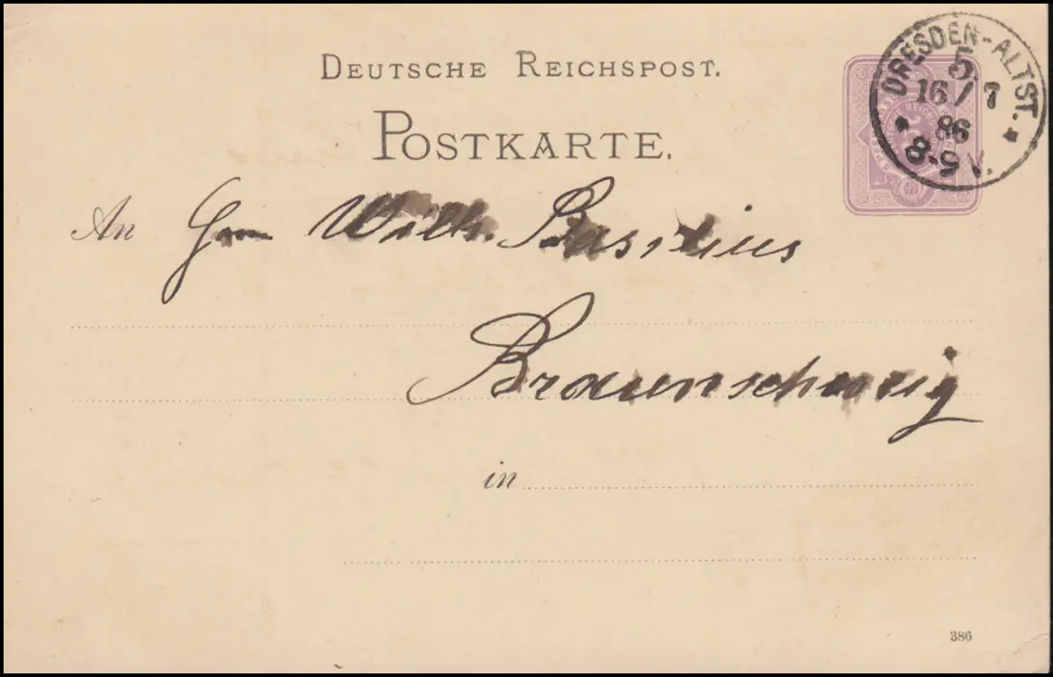Postkarte P 12/02B Ziffer 5 Pf. DV 386, DRESDEN-ALTST. 16.7.86 nach Braunschweig