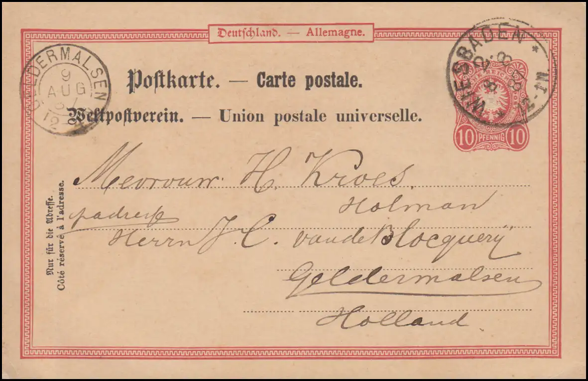 Postkarte P 14/02 WIESBADEN 2. 8.8.87 Auslandspostkarte nach GELDERMALSEN 9.8.87