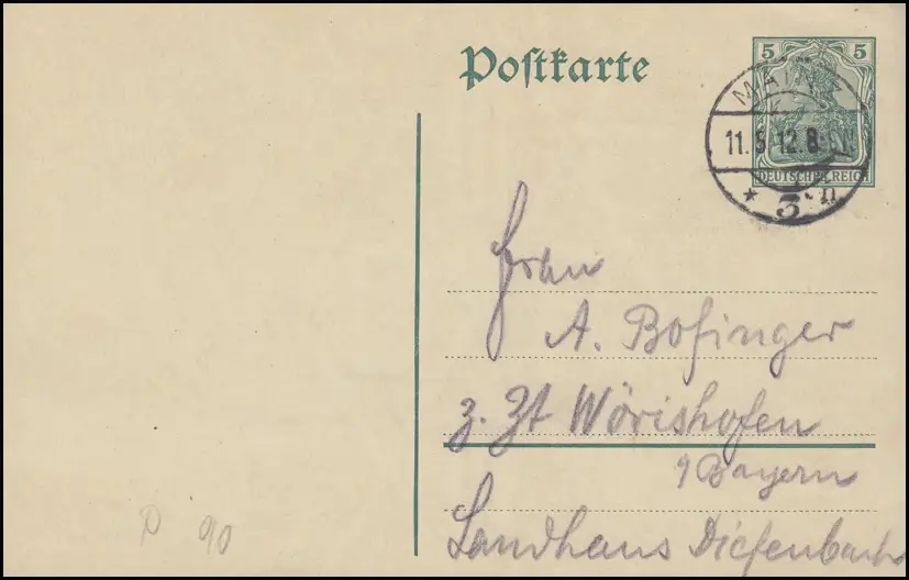 Postkarte P 90I Germania 5 Pf. MAINZ 3 n - 11.5.12 nach Wörishofen