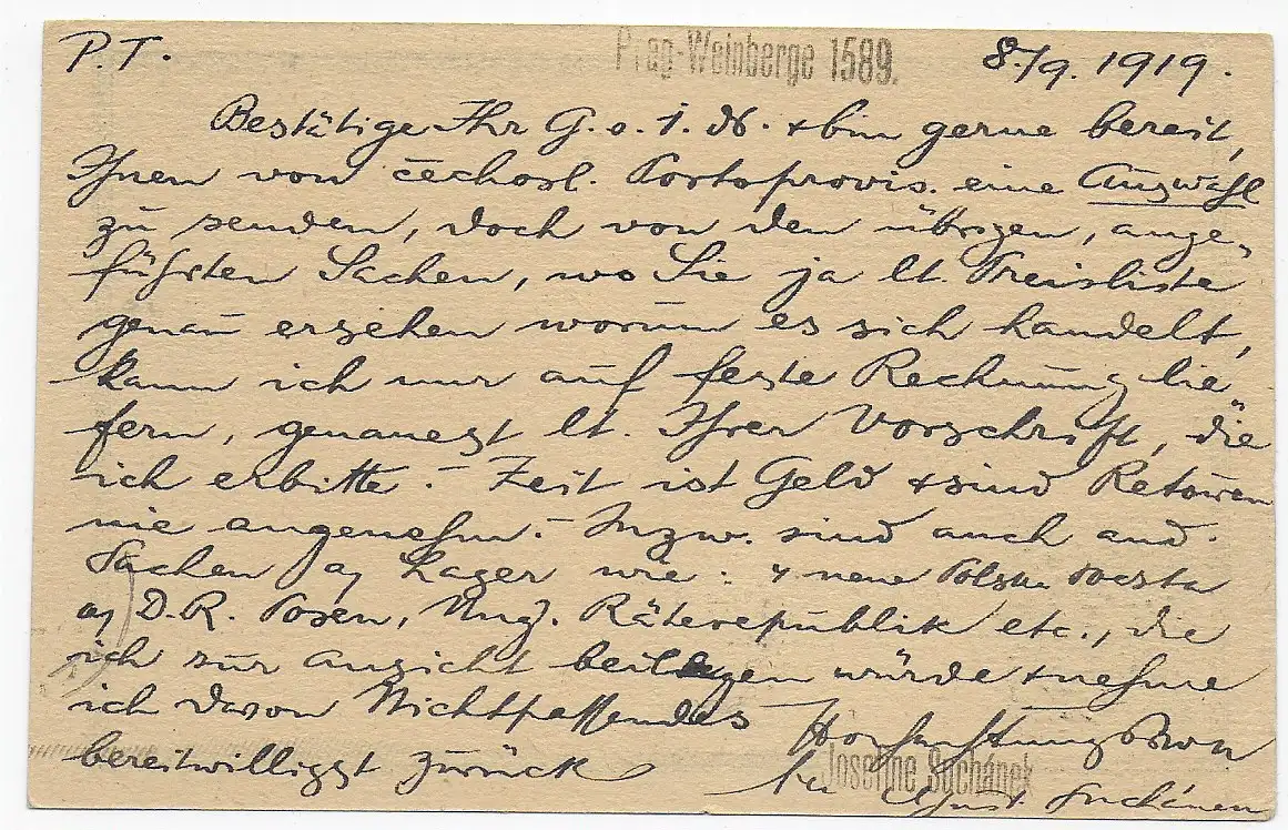 Postkarte Prag-Weinberge in die Schweiz/Basel 1919