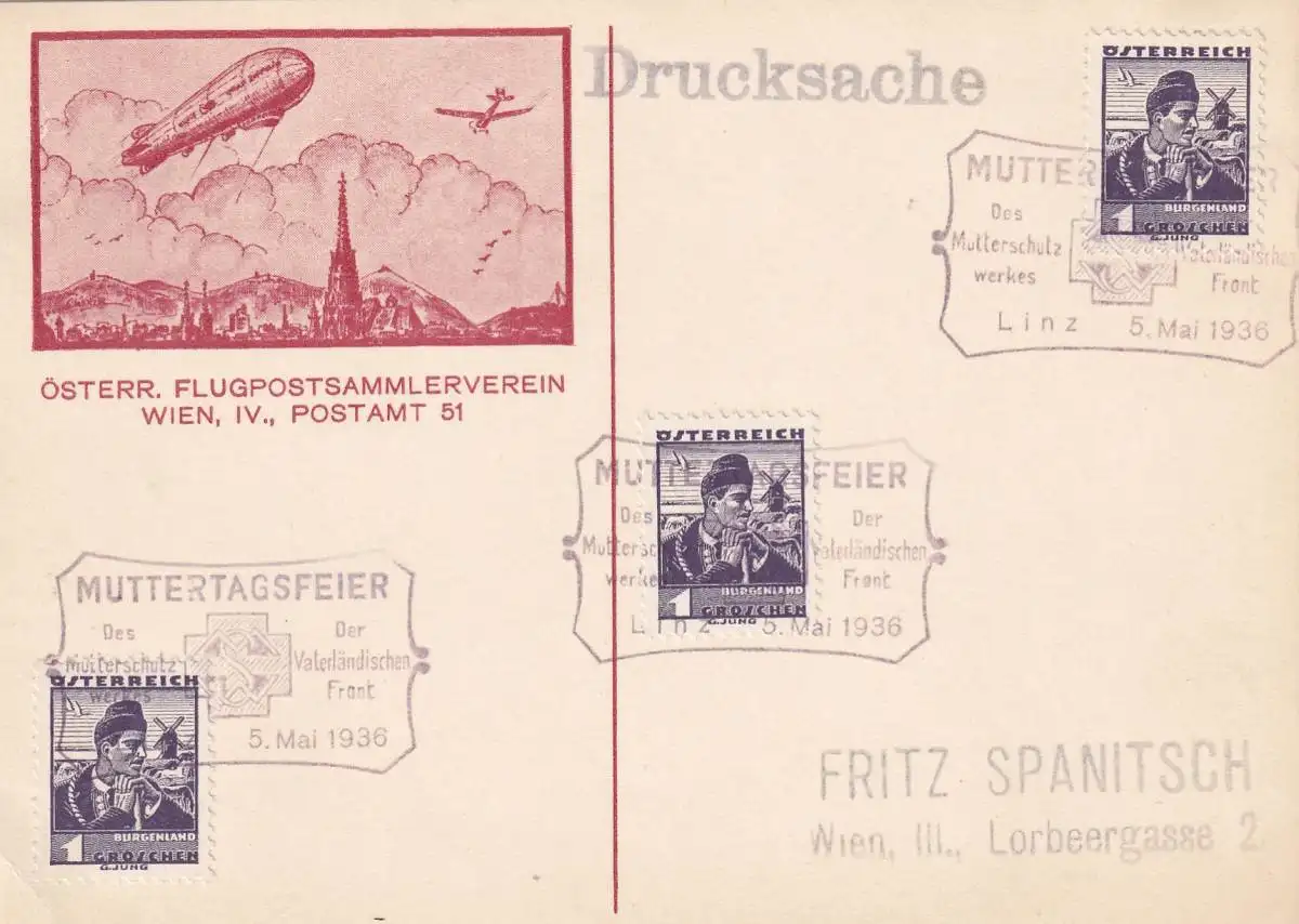 Postkarte Zeppelin, Mutterschutzwerk 1936, Vaterländisch Front, Linz