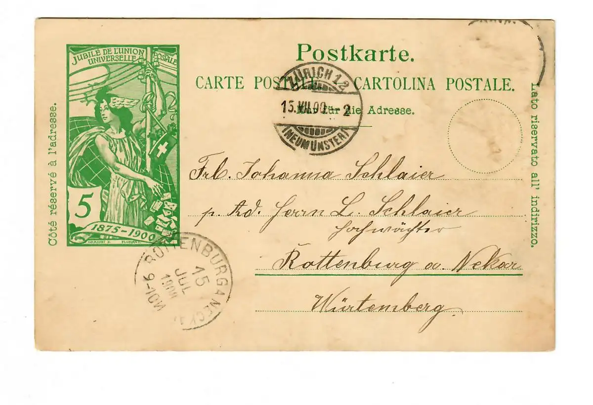 Postkarte Zürich 1900 nach Rottenburg/N