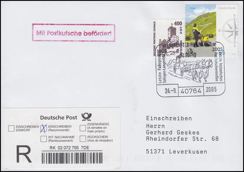 Postkutschenpost: R-Brief SSt Langenfeld/Rheinland Postkutsche 24.9.2005