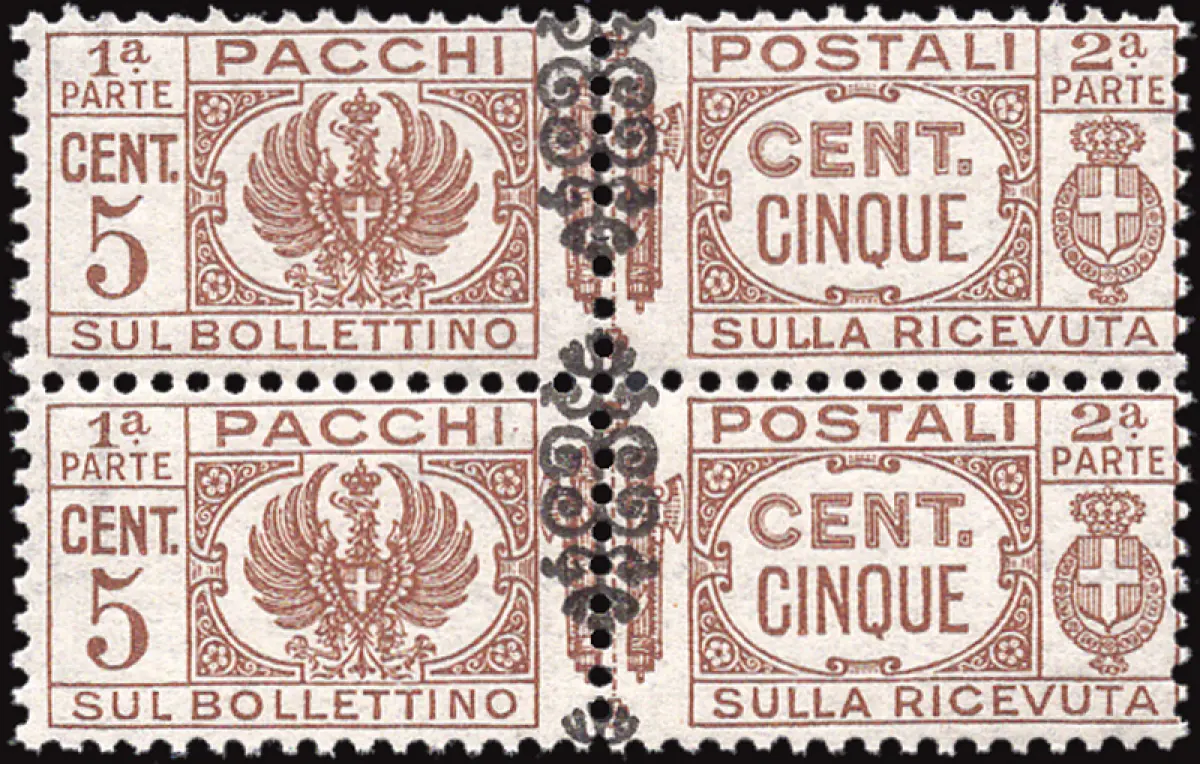 MNH - Vollgummi - - Postpakete Cent. 5 Fries Nr. 53 vertikales Paar mit stark nach oben verschobenem Aufdruck - Sorte noch nicht katalogisiert (ev. n. 48ba) - Uncommon Cod.336/182