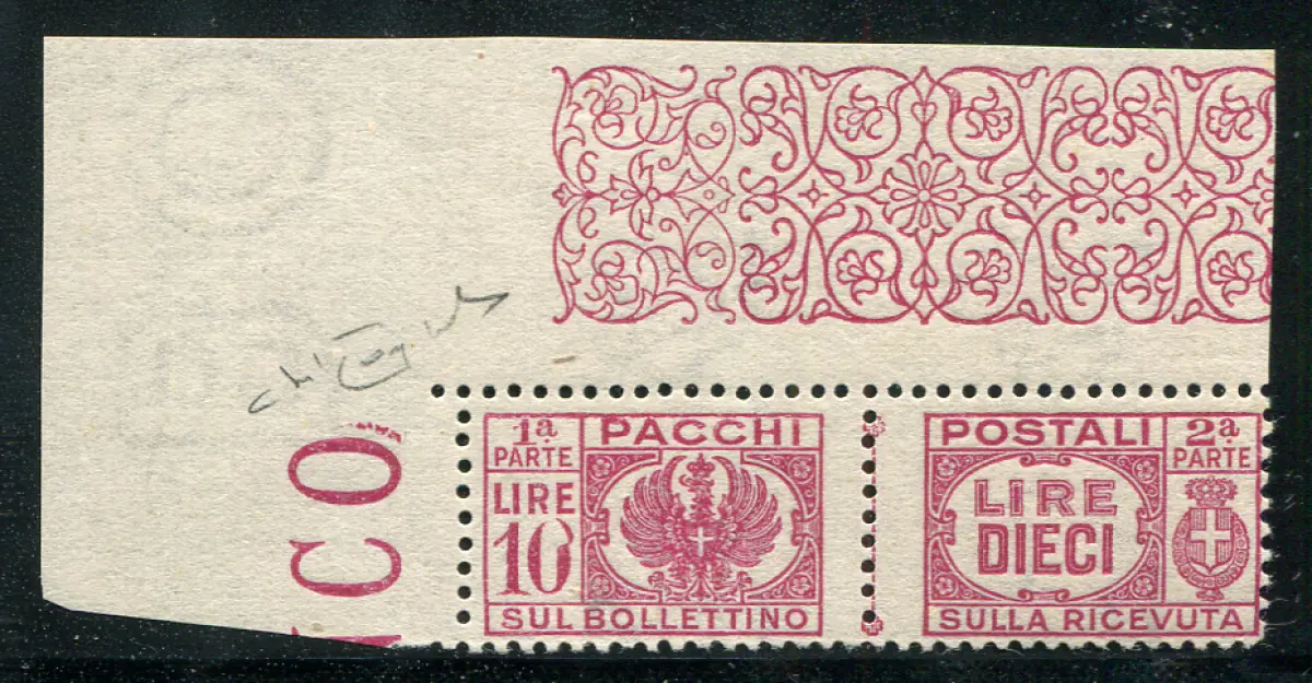 Postpakete Lire 10 Sorten 0 verformt Vollgummi - Postpakete Lire 10 Nr. 64n wunderschönes Exemplar a. von f. mit der 0 von 10 verformt - Ray. - Kat. euro 300 Cod. 166/13
