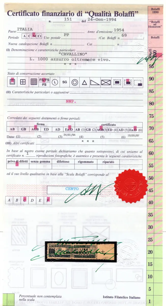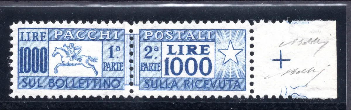 MNH - Vollgummi - - Postpakete Lire 1.000 Pferd Nr. 81/Das wunderschöne Exemplar b. von f. Linearverzahnung - sehr gute Qualität, gut zentriert - Selten in diesem Zustand - Zert. Bolaffi 100% Cod.473/182