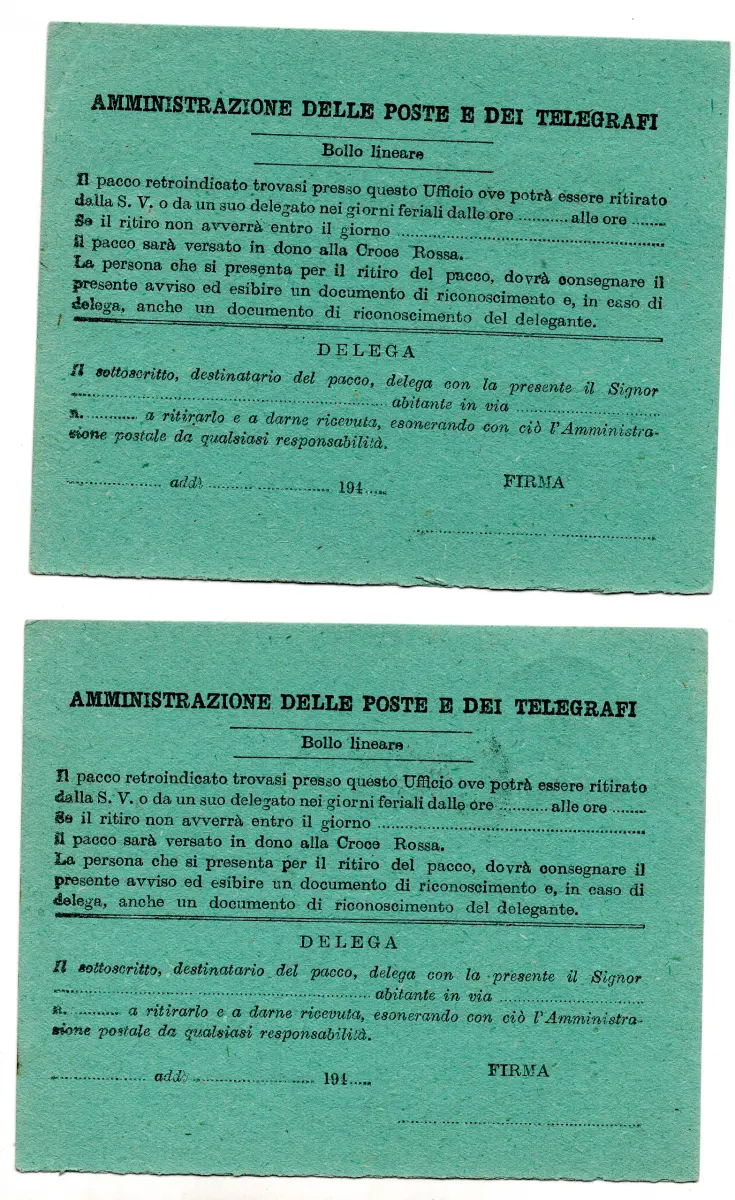 Postpakete - Zwei Paketankunftsbenachrichtigungen (Unterstützung aus den USA) - Postpakete - Zwei Paketankunftsbenachrichtigungen (Unterstützung aus den USA) frankiert für 50 Lire; eine mit 10 Lire + 20 Paar (Nr. 73, 74 x 2) die andere mit 50 Lire isoliert (Nr. 76) Stumme Stornierung + lineare Cantignano - Uncommon Code 349/8