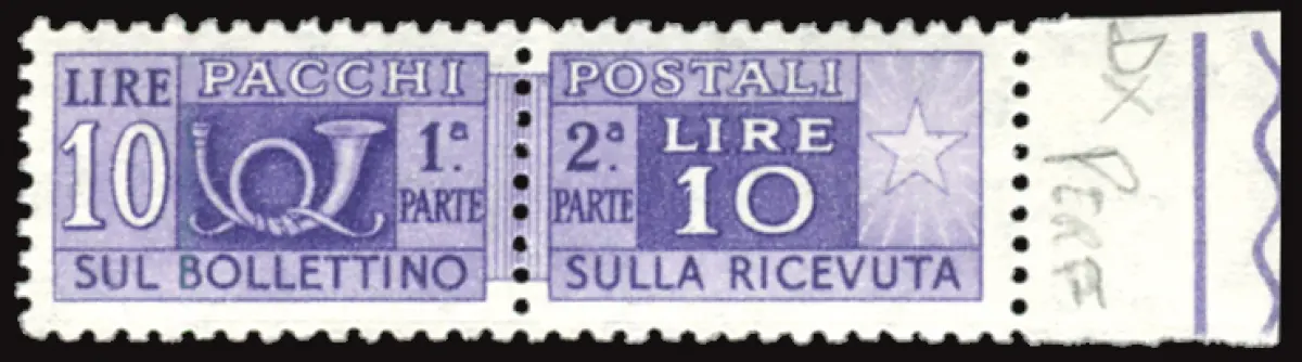 Postpakete l. 10 filigrane Sterne II geneigt zu 65. Rechts Vollgummi MNH - Postpakete l. 10 n. 85/I filigrane Sterne II geneigt zu 65. Rechts, weißer Gummi der II. Auflage (Sass. spec. n. 63/I 65. Rechts) - sehr gut zentriert - Selten - Diego Carraro - Kat. euro 275 Cod. 767/16