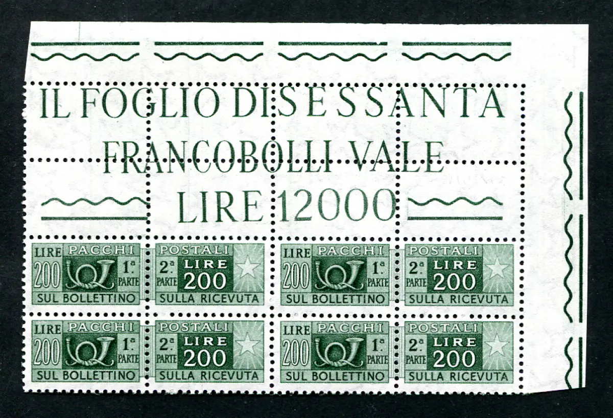 Postpakete l. 200 Sterne IV Vinylgummi eckig perforiert Vollgummi - MNH - Postpakete l. 200 Sterne IV Vinylkautschuk, Viererblock mit Lochblechecke, sinusverziert (Sass. spec. Nr. BA 98, Griffe Nr. 177) - perfekter Vollgummi Cod.1230/WEB