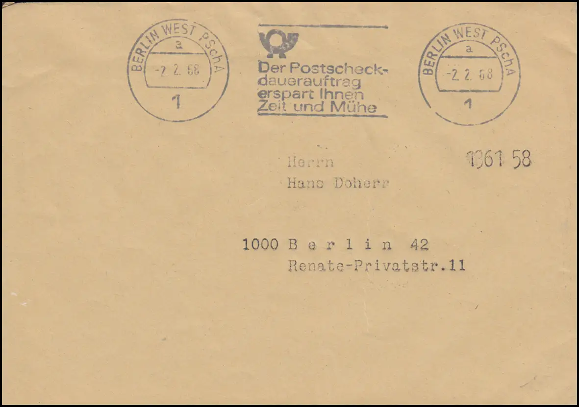 Postsache AFS BERLIN WEST PSCHA Postscheckdaueraufdrag 2.2.1968 auf Ortsbrief