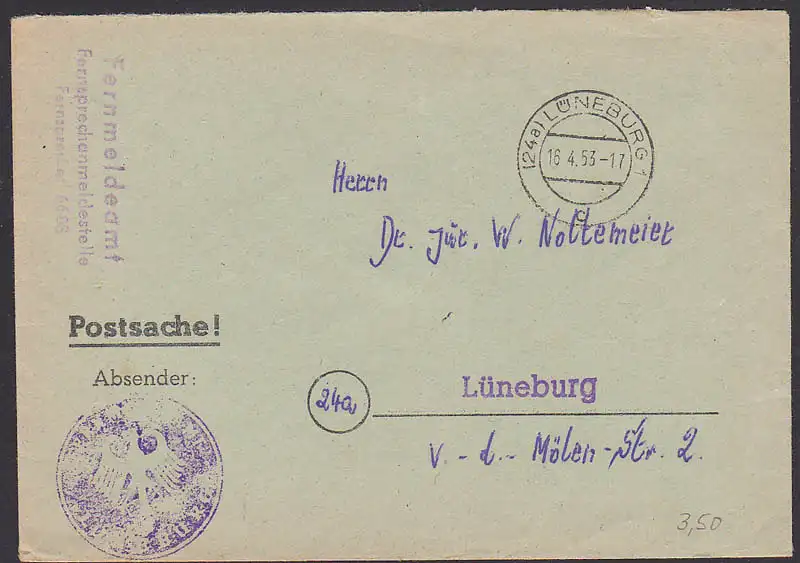 Postsache Lüneburg 16.4.53 mit Amtssiegel vom Fernmeldeamt