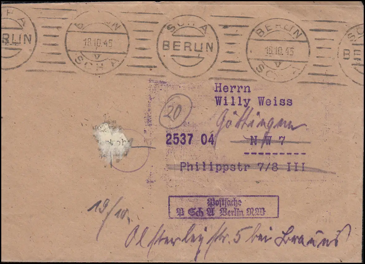 Postsache Postscheckamt Berlin NW Orts-Brief BERLIN SCHA 18.10.1945