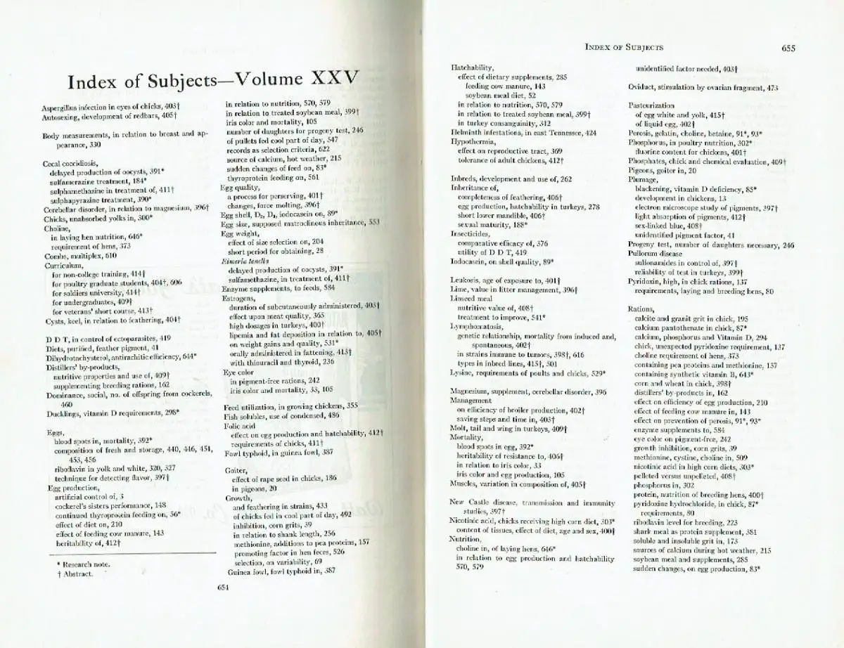 guter Zustand, Gebrauchs- und Alterungsspuren: ehemaliges Bibliotheksexemplar, Vorsatz und Titel mit je 2 Stempeln und Nummern - Seitenschnitt gebräunt / vergilbt und teils leicht fleckig- Seiten sauber und ordentlich - leicht unfrischer Geruch - untere Einbandecken etwas gestaucht, dadurch auch Seiten teils etwas eselsohrig, erschien aller 2 Monate, Buch enthält alle 6 Ausgaben des Jahres 1946 als Beispiel für den Inhalt der des ersten Heftes: - The Artificial Control of Egg Production    G. O. Hall - Plumage Development in Chickens    Robert Penquite, R. B. Thompson, and V. G. Heller - Goiter in Domestic Pigeons    W. F. Hollander and Oscar Riddle - A Short Period for Obtaining R.O.P. Egg Weights E. E. Schnetzler - A Study of the Relationship Between the Iris Color of the Dam and the Mortality of Her Progeny      R. F. Ball and R. K. Cole - Growth Inhibition of Chicks on Rations Containing Corn Grits    P. S. Sarma and C. A. Elvehjem - Observations on an Unidentified Feather-Pigment Factor Necessary for Chickens Fed Purified Diets    George M. Briggs - The Comparative Requirements of Chicks and Turkey Poults for Riboflavin    F. H. Bird, V. S. Asmundson, F. H. Kratzer, and S. Lepkovsky - Effect of Dietary Level of Soybean Meal on Hatchability    D. Whitson, H. W. Titus, and H. R. Bird - An Evaluation of the Toxicity of Certain Sulfonamides for Young Chickens    Paul A. Mattis, S. E. McKinney, Elizabeth A. Patch, and Ethel L. Williams - Semen Production in Broad Breasted Bronze Turkeys Jesse E. Parker - The Effect of Selection of Chicks Upon Variability in Growth Data J. B. O'Neil - Effect of Tung Meal in Rations for Growing Chicks     George K. Davis, N. R. Mehrhof and R. S. McKinney - Studies on the Pyridoxin Requirements of Laying and Breeding Hens    W. W. Cravens, E. E. Sebesta, J. G. Halpin, and E. B. Hart - Research Notes - The Effect of Sudden Changes of Feed upon Production J. B. O'Neil - Abnormal Blackening of the Feathers of New Hampshire Chicks as the Result of Vitamin D Deficiency    E W Glazener, J. P. Mattingly, and G. M. Briggs - Effect of Withholding Feed and Water on Early Poult Mortality and Growth W. T. Chilson and H. Patrick - Value of High Levels of Calcium Pantothenate and Pyridoxine Hydrochloride in Chick Diets Free of Animal Protein    H R  Bird and Max Rubin - The Effect of Vitamins D2 and D3 in Fish Oils and of lodocasein of Shell Quality H. S. Gutteridge and Jean M. Pratt - The Influence of Gelatin on Prevention of Perosis in Turkeys Fed Choline and Betaine James McGinnis - The Effect of Gelatin on the Antiperotic Properties of Choline, Betaine and Yeast H. L. Lucas, L. C. Norris and G. F. Heuser - News and Notes - Book Review, Leinen, ca. 17 x 26, 656 Seiten mit einigen Bildern und Diagrammen
