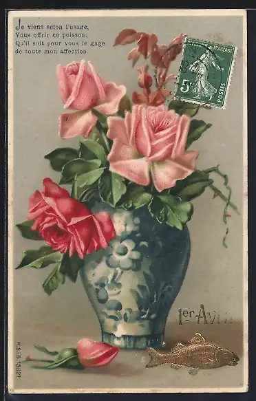 Präge-AK 1. April, Rosenvase und goldener Fisch