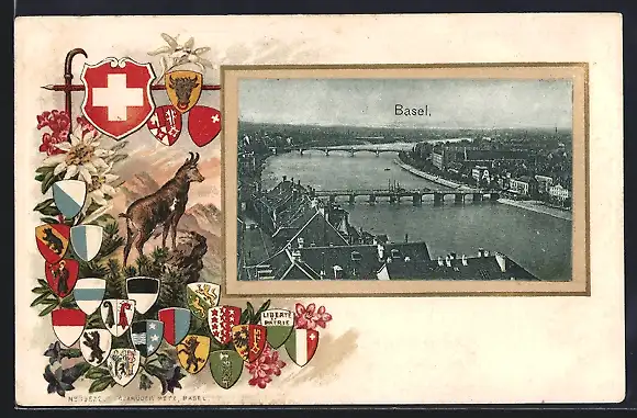 Präge-AK Basel, Stadtpanorama mit Flusspartie, Passepartout mit Gämse und Wappen