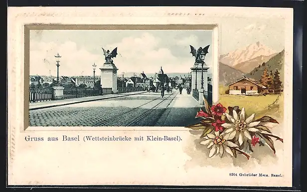 Präge-AK Basel, Wettsteinbrücke mit Klein-Basel und Edelweiss