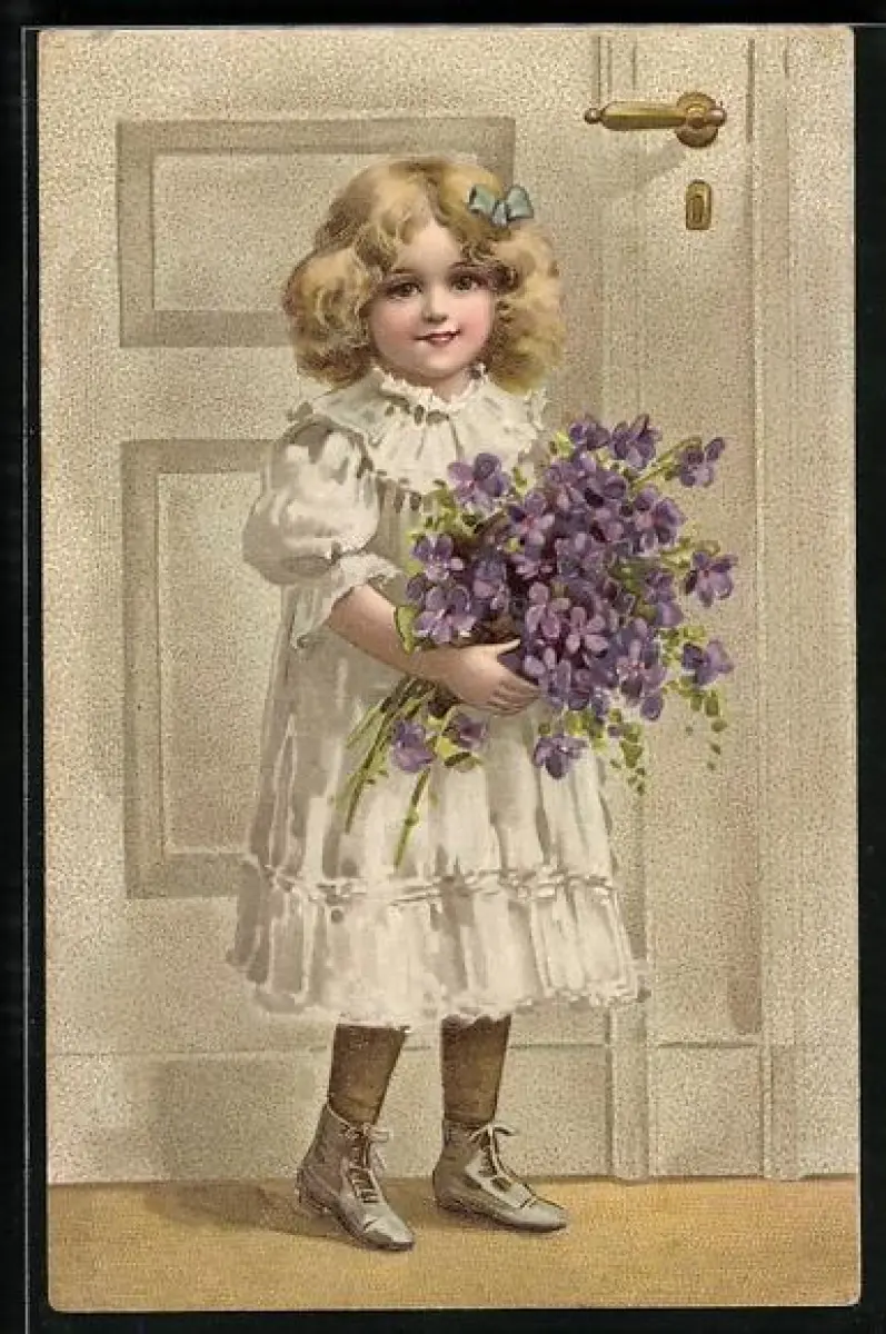 Präge-AK Blondes Mädchen mit einem Veilchenstrauss