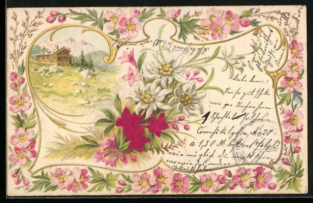Präge-AK Blumengruss mit Edelweiss und Alpenrosen