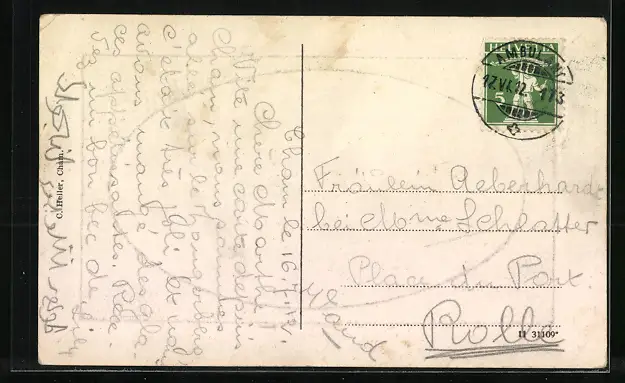 Personenbezogene Daten auf der Rückseite der Karte wurden durch blauen Textmarker unkenntlich gemacht. Die blauen Stellen sind auf die Vorderseite durchgeweicht und wirken sich negativ auf das Postkartenfoto aus