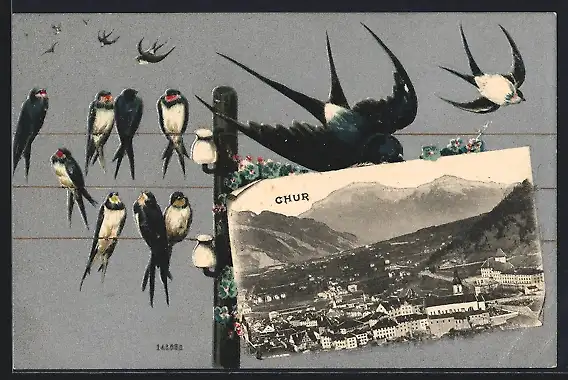 Präge-AK Chur, Totalansicht mit Bergpanorama, Schwalben auf Telefonleitung