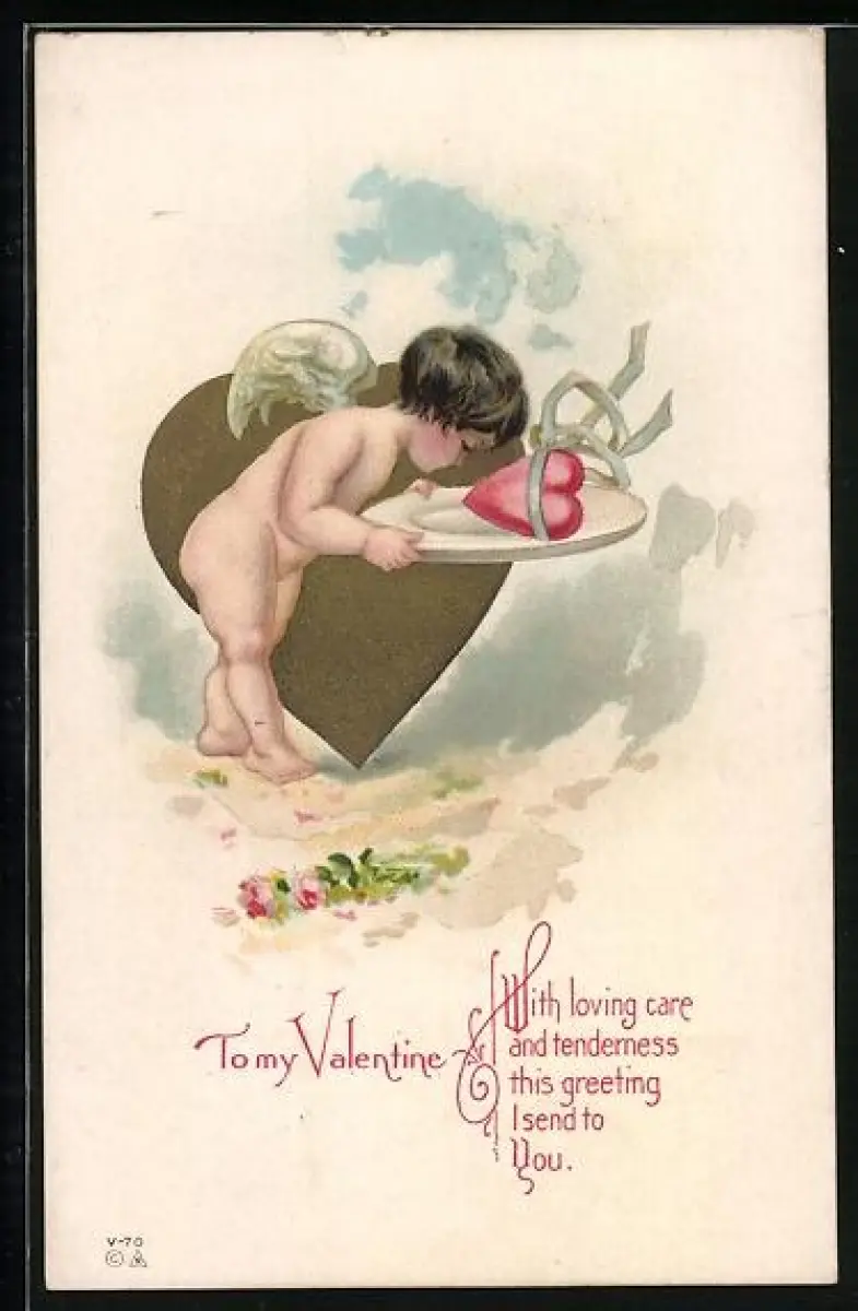Präge-AK Engel bringt einen Teller mit Herz, To my Valentine