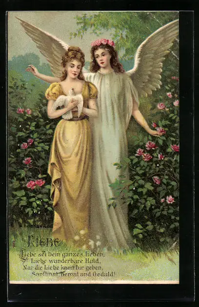 Präge-AK Engel der Liebe, Frau mit Friedenstaube