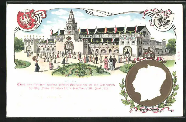Präge-AK Frankfurt / Main, Wettstreit Deutscher Männer-Gesangsvereine 1903, Festhalle, Kaiserpaar, Wappen