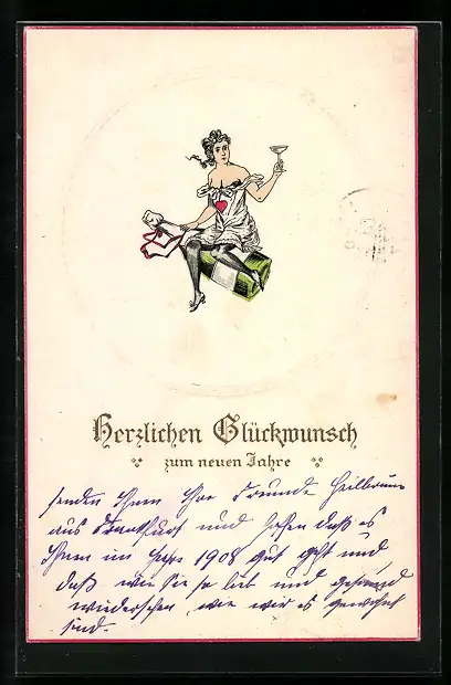 Präge-AK Frau auf Sektflasche mit Glas in der Hand, Neujahrsgruss